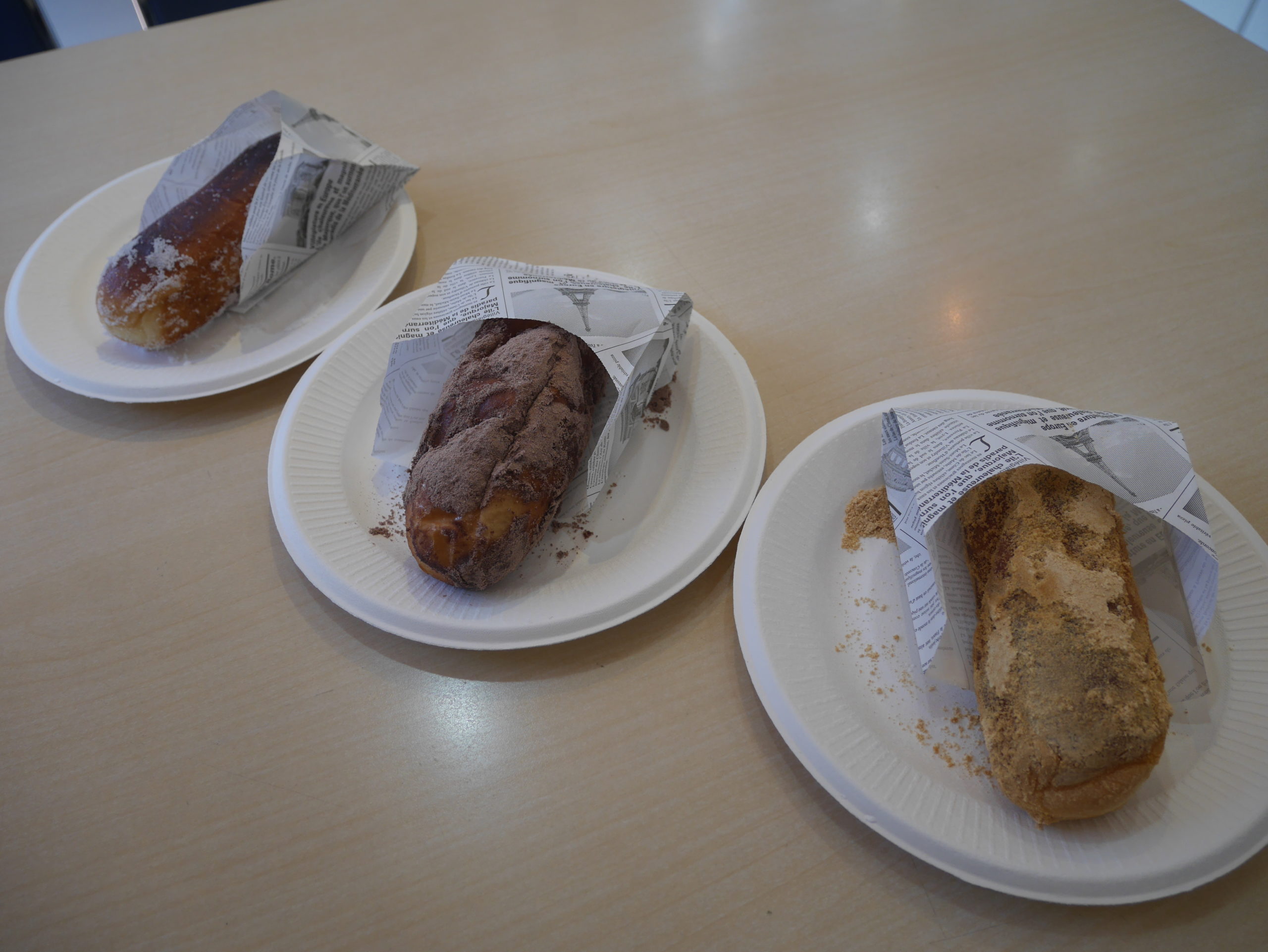 屋台ではあまり見かけないメニューですが、誰もがなじみがあること、調理工程が少なく提供がしやすいこと、味のバリエーションが作りやすいことなどをふまえ、決定しました。基本的には「パンを揚げる」→「粉をまぶす」というシンプルな工程ですが、誰もが知っているメニューだからこそ、思い出の中のその味を超えるべく試行錯誤しました。結果、形やサイズまでこだわって選んだパンを、高温の油で短時間でカラッと揚げることで、外はカリっと、中はフワッとした食感に仕上げることができました。味は定番の「ココア」「きなこ」「シュガー」の3種類を用意。1個100円と思い切った価格設定にして当日を迎えました。