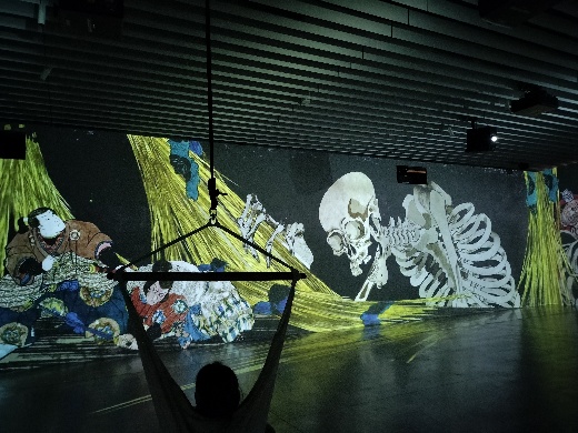 午後は合流し、全員で体感型デジタルアート「浮世絵Re:Born」を鑑賞。浮世絵というととっつきにくいイメージがあるかもしれませんが、最新のデジタル映像技術が用いられ、浮世絵の世界に入り込んだような没入感のある体験をすることができました。生徒たちも普段あまり馴染みのないジャンルだったと思いますが、映像や音楽に圧倒され、その世界に浸っていたようです。